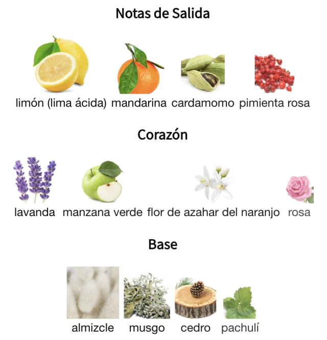 - Notas de corazón: Lavanda, flor de azahar del naranjo, rosa, manzana verde.