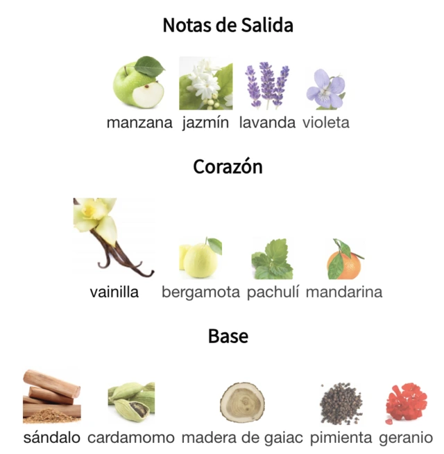 Notas de Salida: Manzana, Jazmín, Lavanda, Violeta