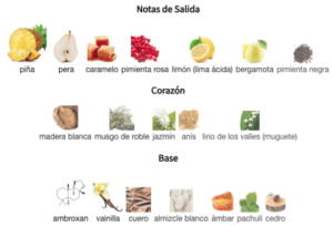 Notas de Salida: Piña, Pera, Caramelo, Pimienta Rosa, Limón (Lima Ácida), Bergamota, Pimienta Negra