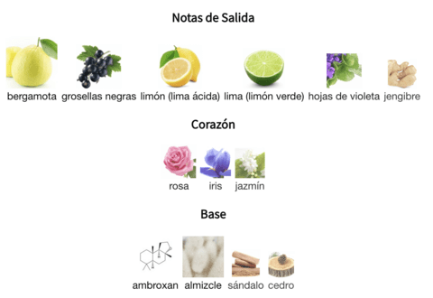 • Notas de Corazón: Jazmín, Rosa, Cedro, Lirio de los Valles (Muguete)