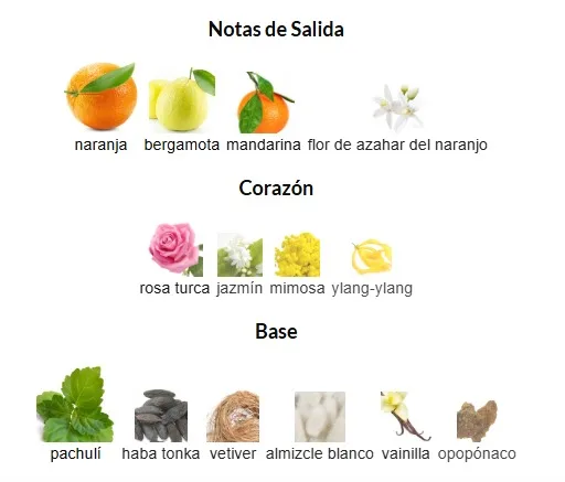 Notas de Salida: Bergamota, Naranja, Mandarina, Flor de Azahar del Naranjo